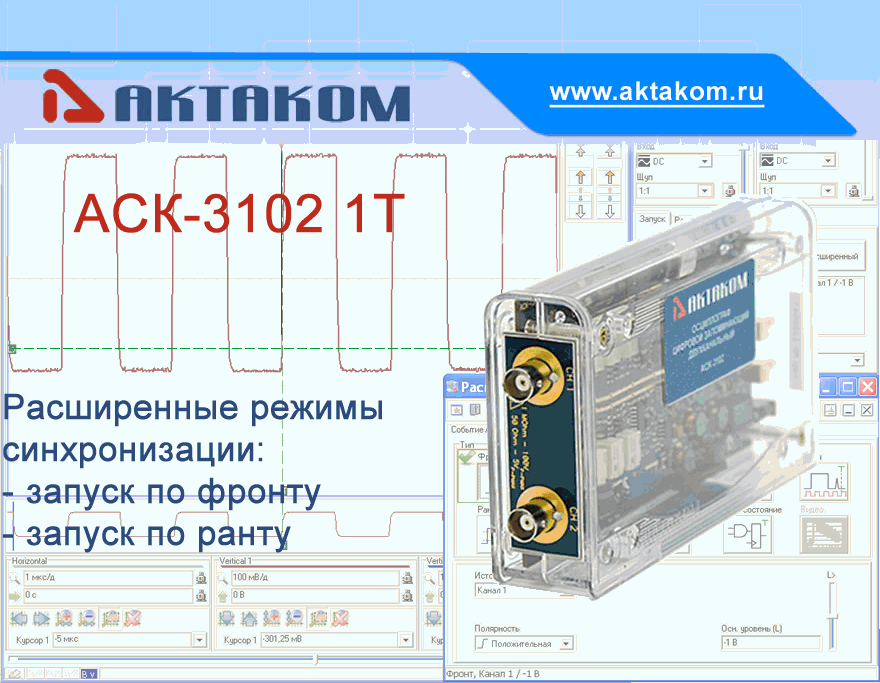 Анимация ниже демонстрирует режим записи по ранту отрицательной полярности длительностью больше 500 нс осциллографом АКТАКОМ АСК-3102 1Т. Как видно из осциллограммы, сигнал имеет несколько аномалий, удовлетворяющих установленному требованию по запуску.